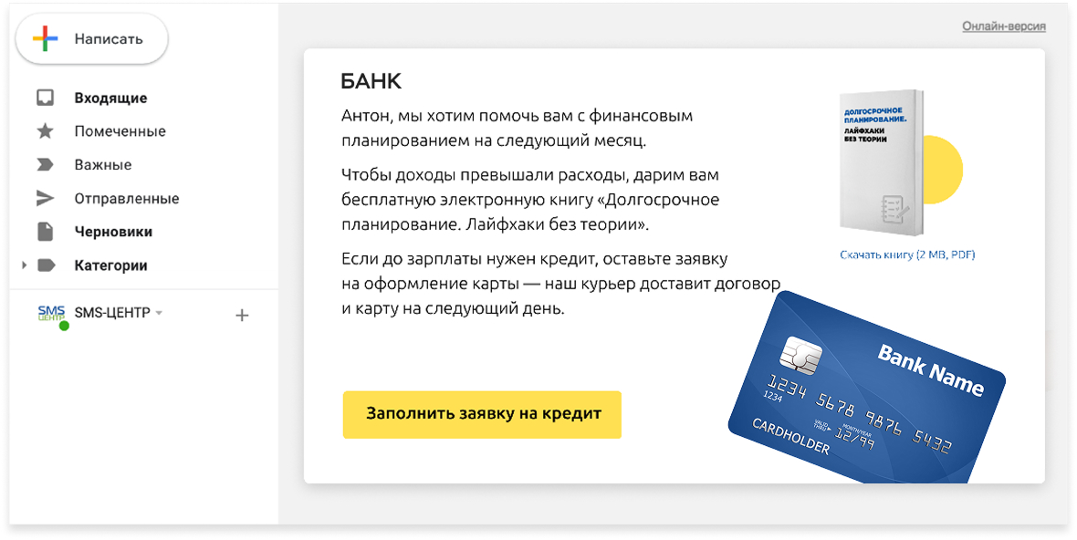 На примерах банков это выглядит так: отправляйте предложение кредитной карты клиенту, у
